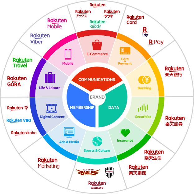 - Fintech: la division fintech offre de nombreux services à travers le monde : cartes de crédit, courtage en ligne, émission des Rakuten Points pour le programme de fidélité, banque, assurance…Rakuten est le numéro 1 du paiement en ligne et le premier émetteur de cartes bancaires au Japon.